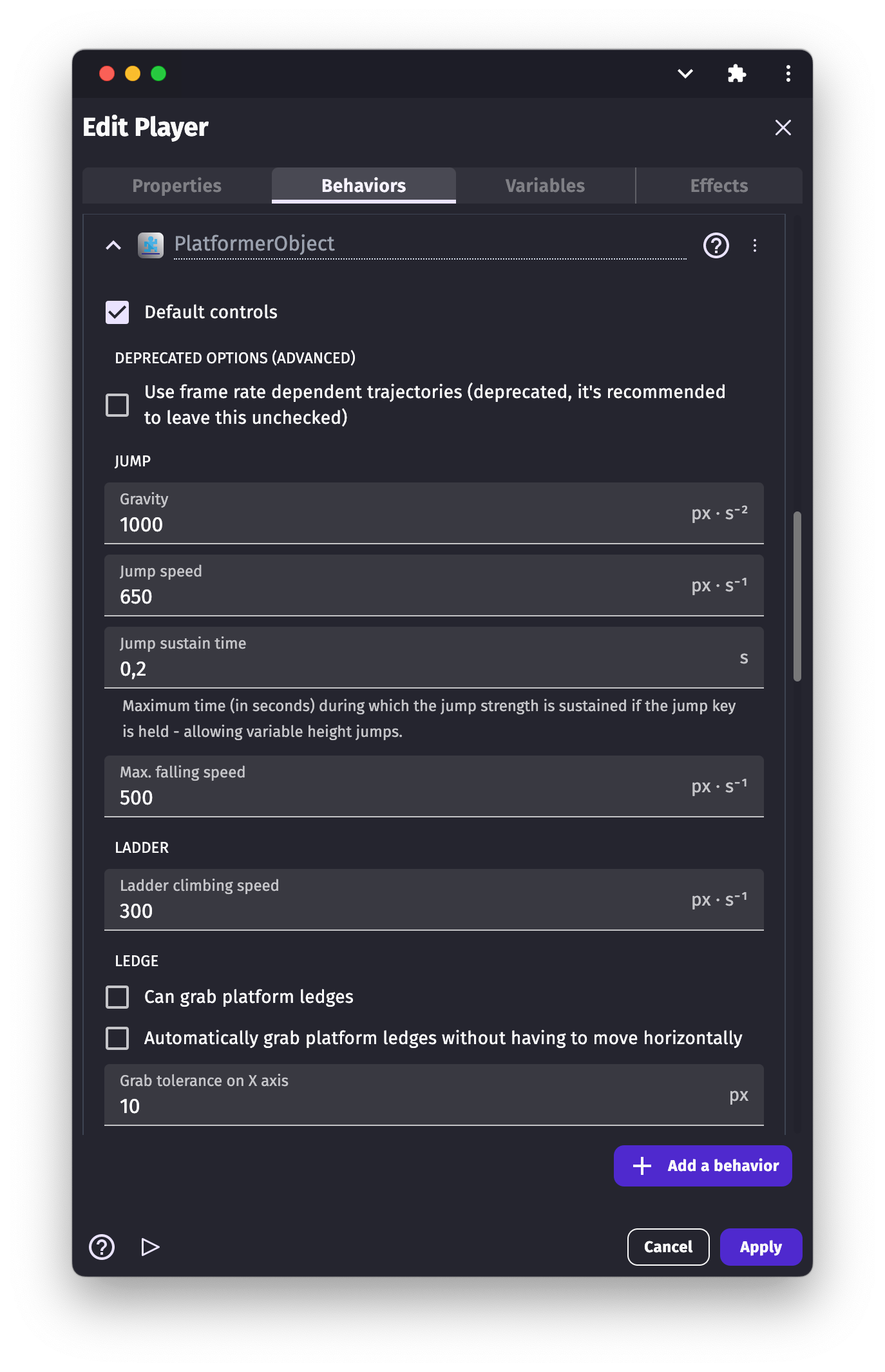 As with the Platform Behavior, we have the "Grab the ledge" option for the "Platformer character". This option allows the character object to grab the ledge of the platforms. The option is disabled by default. To enable it, tick/check the box in the options list.