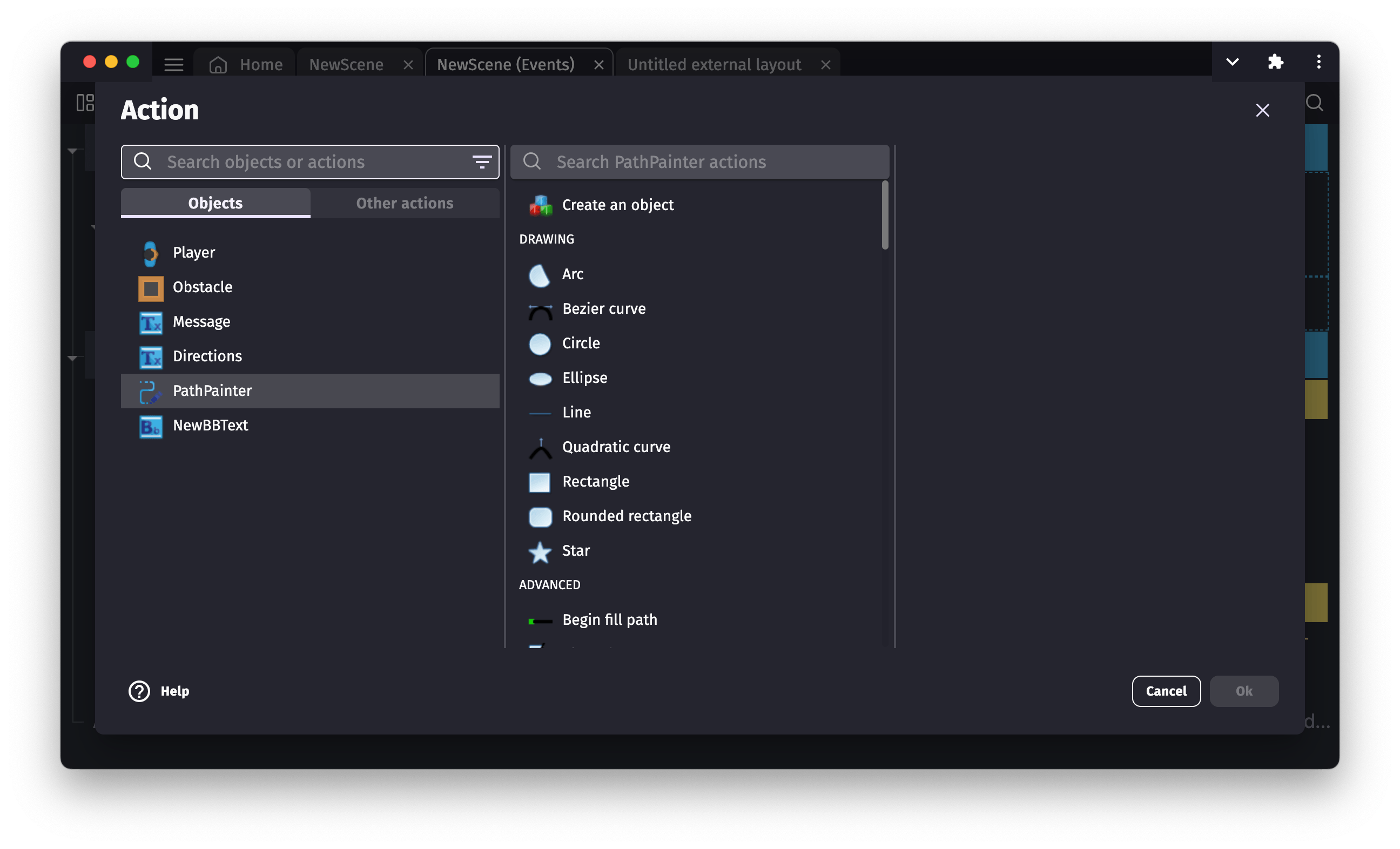 When you add an action to an event, select a Shape Painter object to display a list of shapes that can be drawn:
